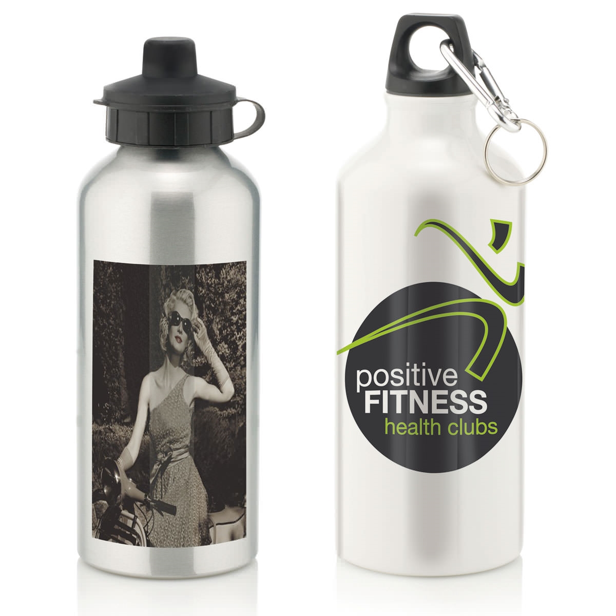 A 600ml aluminium water bottle ready for personalising. Available in white and silver with 2 caps included.