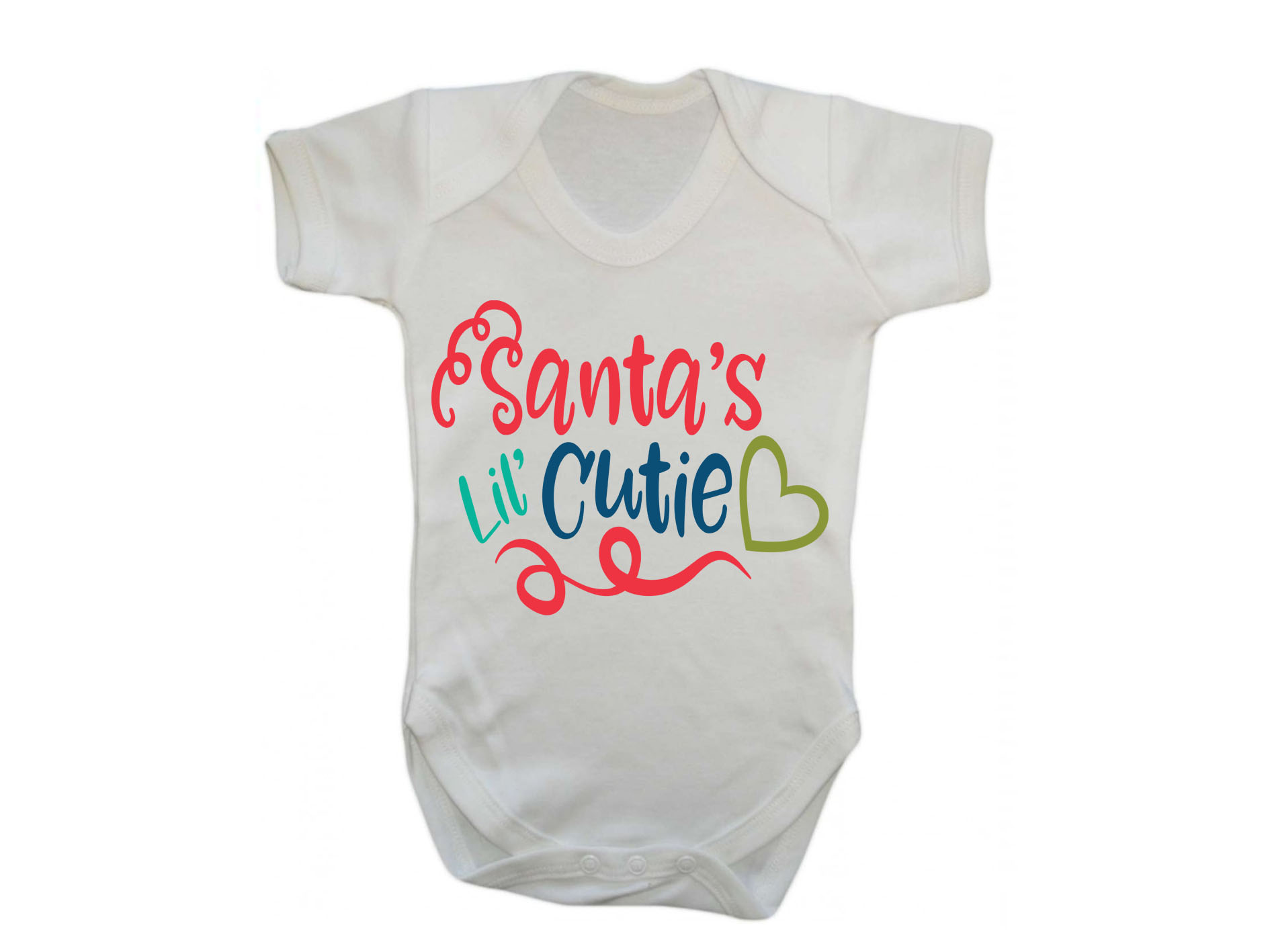 Our 100% Cotton ‘Santa’s Lil Cutie’ short sleeve vest is available in 4 colours. To make sure the vest stands out, when choosing a coloured vest the writing will change accordingly.