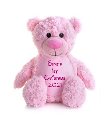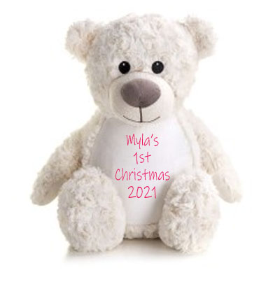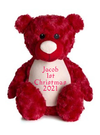 Our large personalised bear sits at 42cms high and is made of 100% Polyester plush soft swirl fabric. Colours available Grey, Red, White, Pink and Blue.